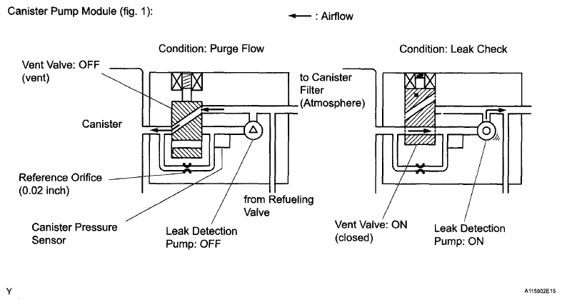 The leak detection pump creates negative pressure (vacuum) in the EVAP system and the pressure is measured. Finally, the ECM monitors for leaks from the EVAP system, and malfunctions in both the canister pump module and purge VSV, based on the EVAP pressure.