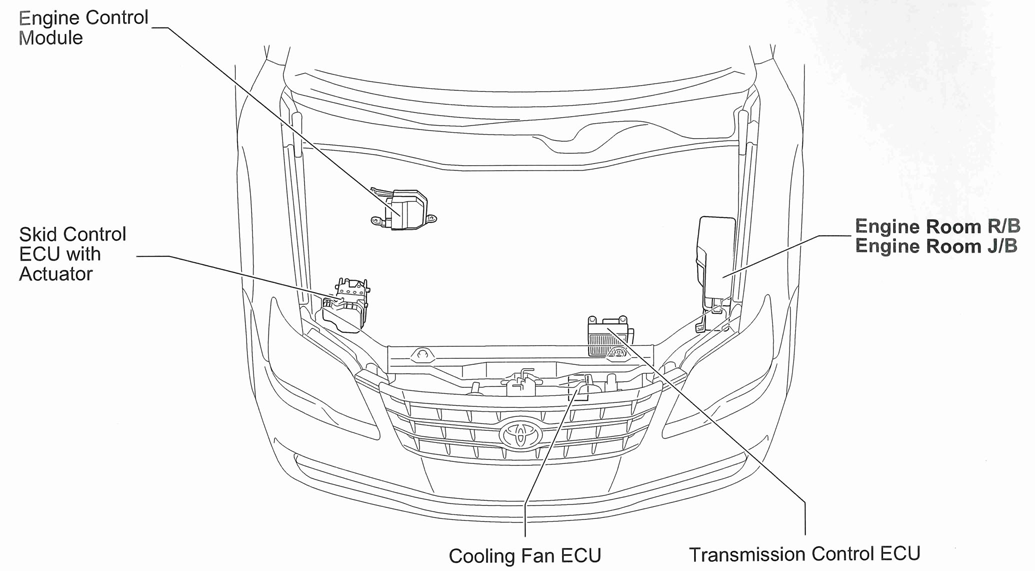 | Cooling Fan ECU | Front of engine compartment. See Figure. |