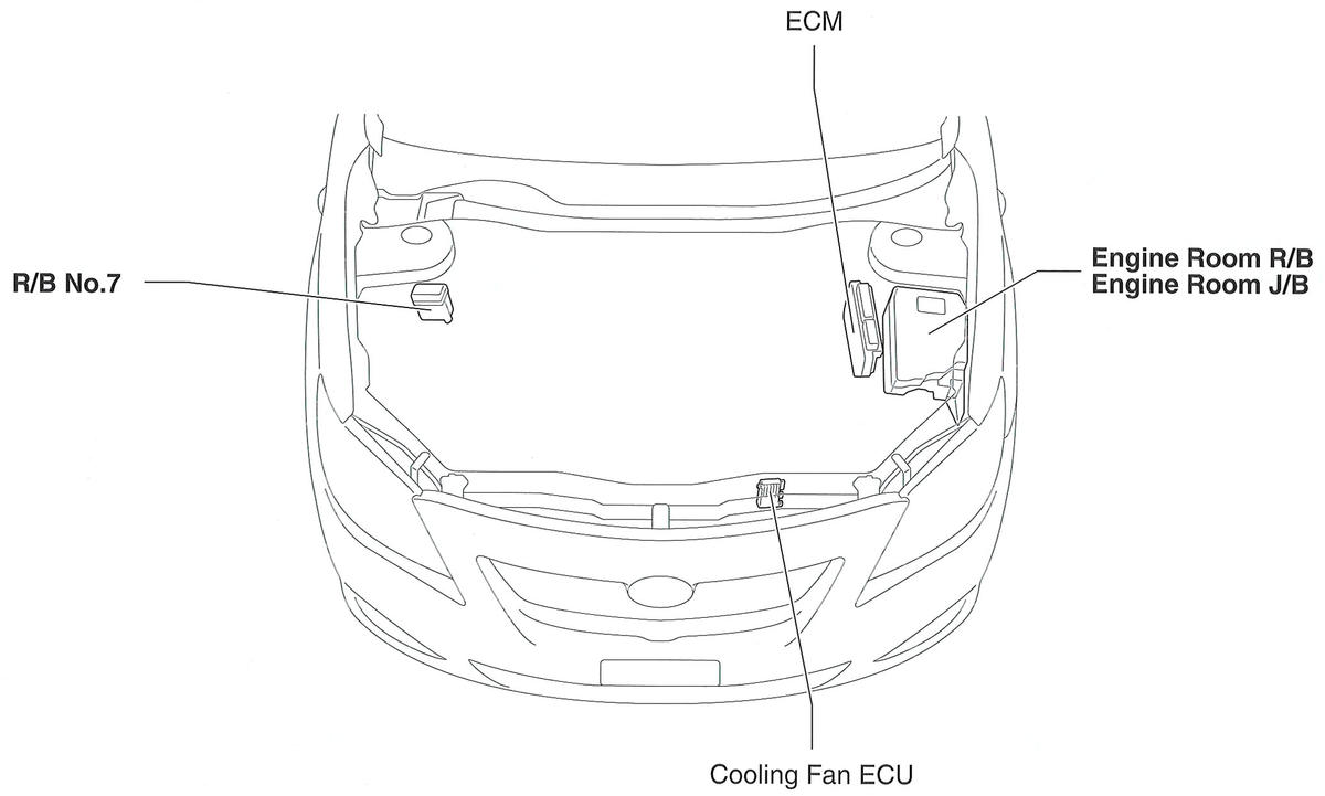 | Cooling Fan ECU | Left front of engine compartment. See Figure. |