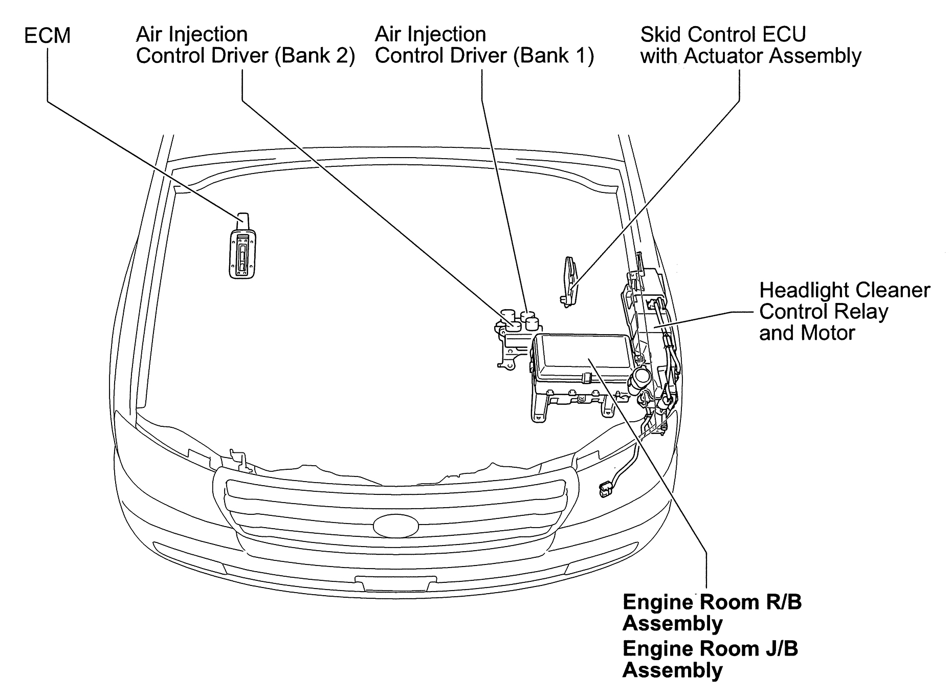 | Skid Control ECU | Left rear engine compartment. See Figure. |