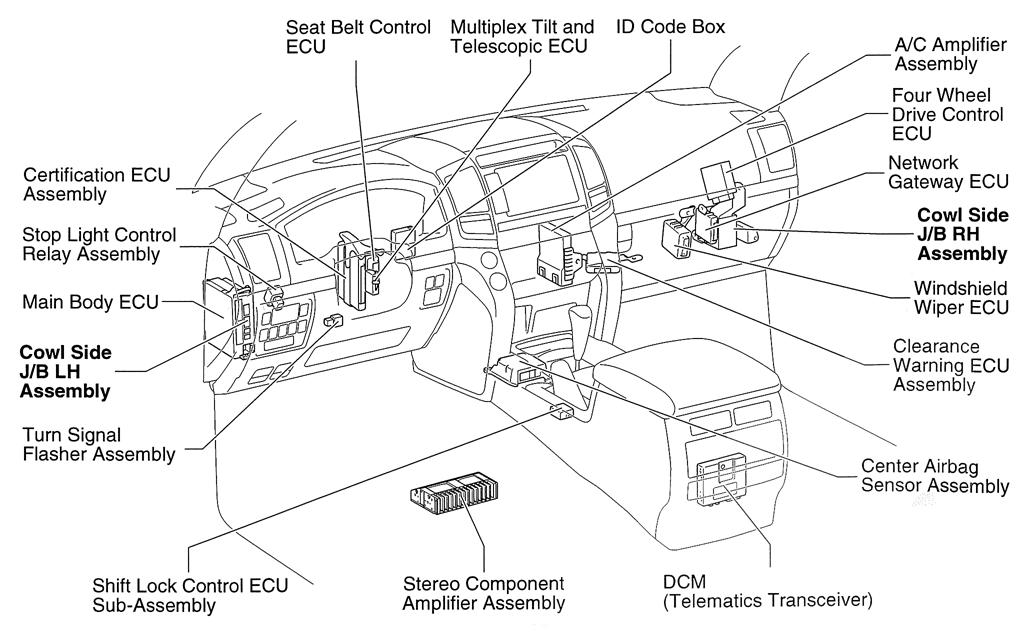 | Main Body ECU | Left end of dash. See Figure. |