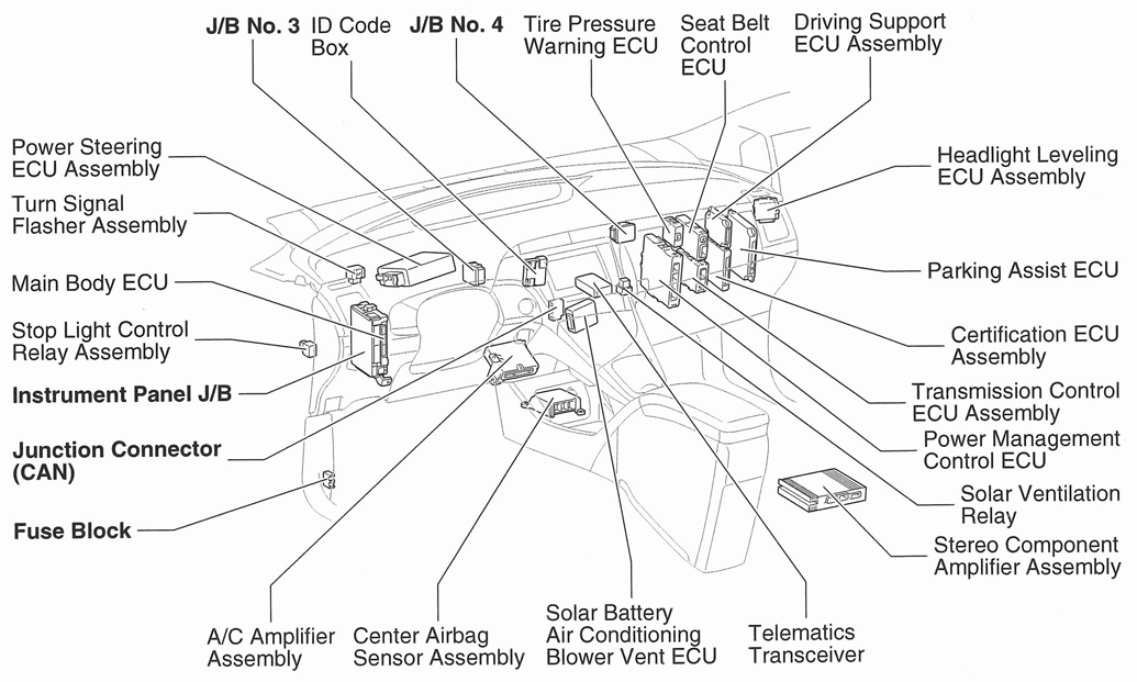 | Main Body ECU | Behind left end of dash. See Figure. |