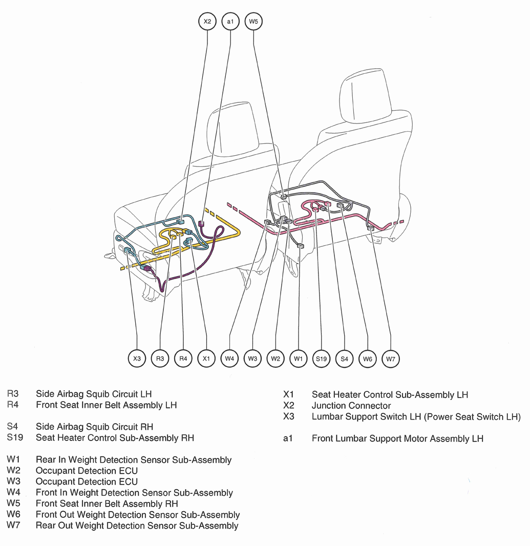 | Occupant Detection ECU | Under front passenger's seat. See Figure. |