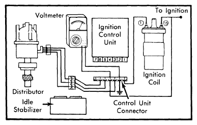 5. Connect voltmeter terminals to outer pins of distributor plug connector. Turn ignition switch "ON". Voltage reading should be a minimum of 5 volts. If ignition control unit does not perform as specified, check wiring circuit for broken wires. If wires are not broken, replace ignition control unit.