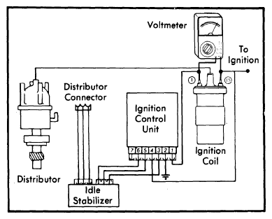 2. Turn ignition switch "OFF" and reconnect ignition control unit plug. Disconnect distributor connector plug. Connect the positive lead of voltmeter to terminal 15 of coil and the negative lead to terminal 1 of coil. See Fig 2.