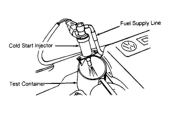 - Remove and jumper ignition coil secondary wire to ground. Attach metal housing of cold start valve to ground. Direct cold start valve injector into a clean container. See Fig 1