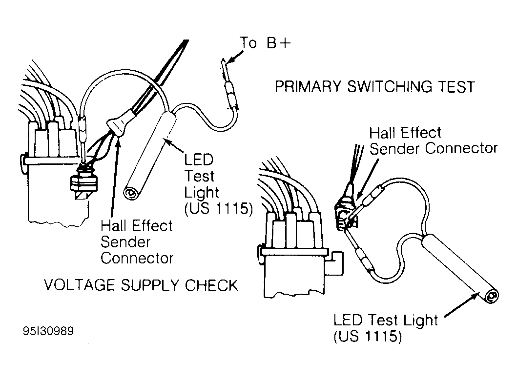 - Reconnect Hall Effect sensor harness connector. Pull back Hall Effect sensor boot to expose contact terminals. Connect LED Test Light (US 1115) probe to center contact and battery positive terminal. See Fig 1. Observe test light while cranking engine. If test light blinks, Hall Effect sensor is okay. If light does not blink, replace Hall Effect sensor.