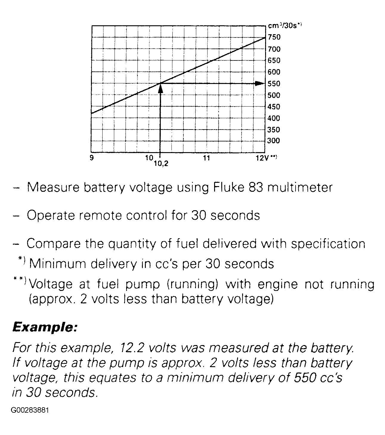 .NOTE: Voltage shown in graph in Fig 3 is at fuel pump. Battery volage is about 2 volts more than that measured directly at fuel pump.