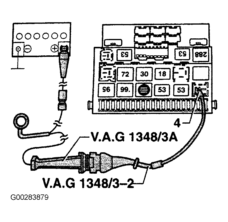 3. Remove fuel pump relay from relay panel. Connect Remote Control Switch (VAG 1348) between battery positive source and fuel pump terminal. See Figure .