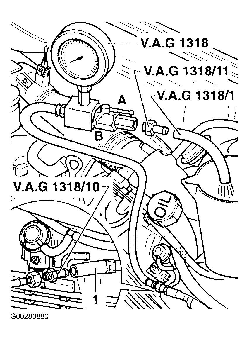 2. Connect Pressure Gauge (VAG 1318), or equivalent, at fuel supply line/hose in engine compartment. See Fig 1 . Open shut-off valve of fuel pressure gauge; lever points in the direction of flow (A). Reinstall fuel pump fuse No. 18 (if removed).