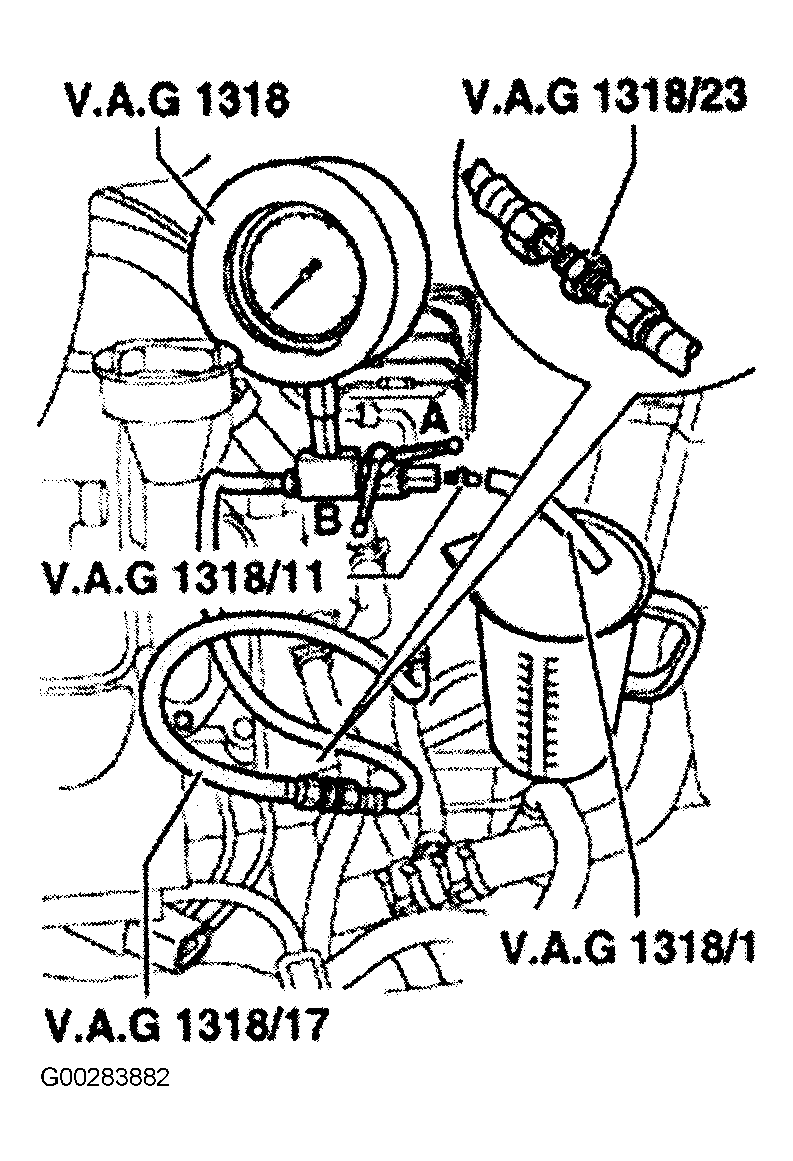 8. If minimum fuel pump volume is not as specified, check fuel lines for possible restrictions, kinks or blockages. Connect Pressure Gauge (VAG 1318), or equivalent, at fuel filter. See Figure .