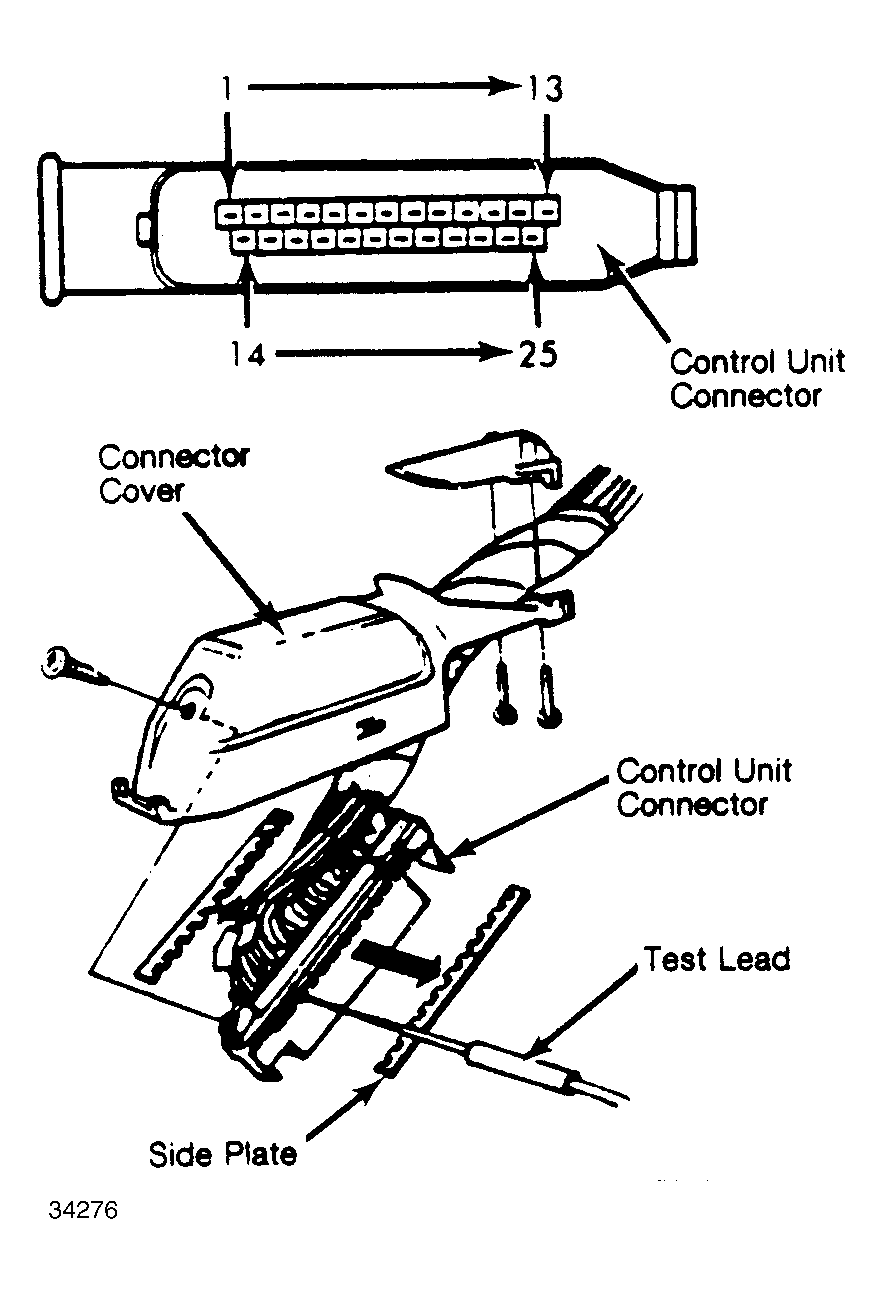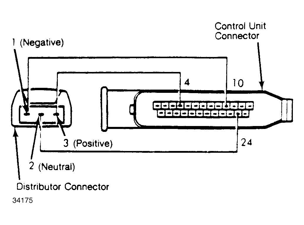 15. Measure resistance between negative terminal (Black wire) and ground. Ohmmeter reading should be zero ohms. If ohmmeter indicates infinity, check wiring between connector and terminal 10 of ignition control unit. Also check for defective control unit ground (terminal 20). Reconnect distributor.