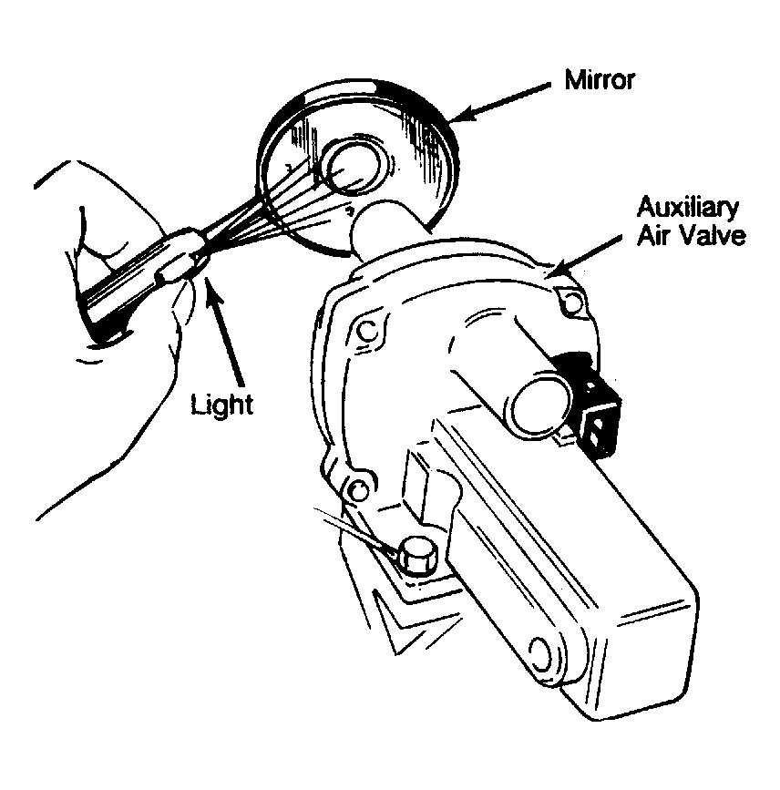 - Disconnect hoses from auxiliary air valve. Use a mirror and small flashlight to inspect valve. See Fig 1 . At room temperature, valve should be slightly open. If equipped, disconnect wires from air flow sensor. With ignition switch "ON" valve should cover opening within 5 minutes.