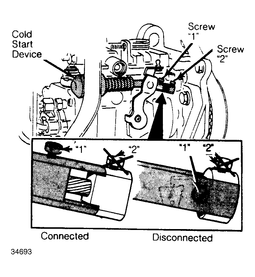 - Remove rear timing gear cover. Disconnect cold start device by loosening screw "1", pushing lever forward and rotating it 90°. DO NOT touch screw "2". See Fig 1 . If it is loosened, cold start device must be reset on a test bench.