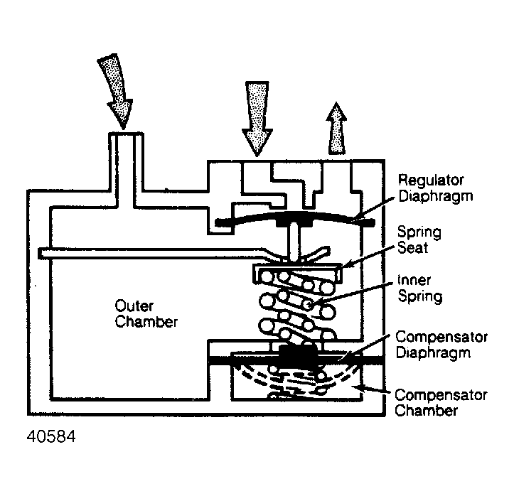 At high altitudes (above 4000 ft.), fuel supply is decreased in same proportion as air density. Normally, control pressure is regulated by a diaphragm and a spring. To achieve altitude compensation, another diaphragm with a spring and a chamber have been added. See Fig 1 .