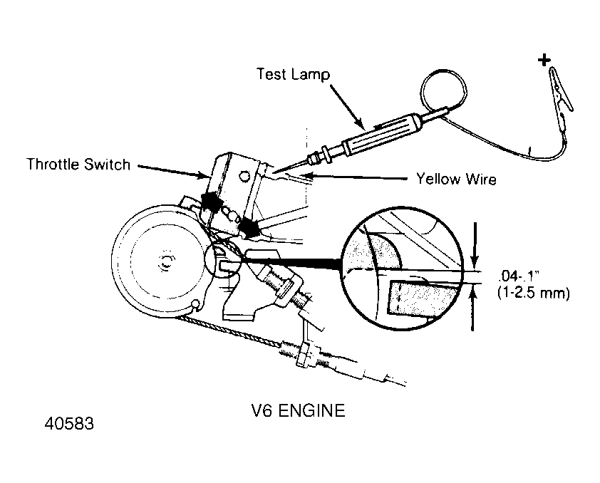 Check that switch closes (test lamp lights) .04-.1" (1-2.5 mm) before throttle control pulley touches full throttle stop. See