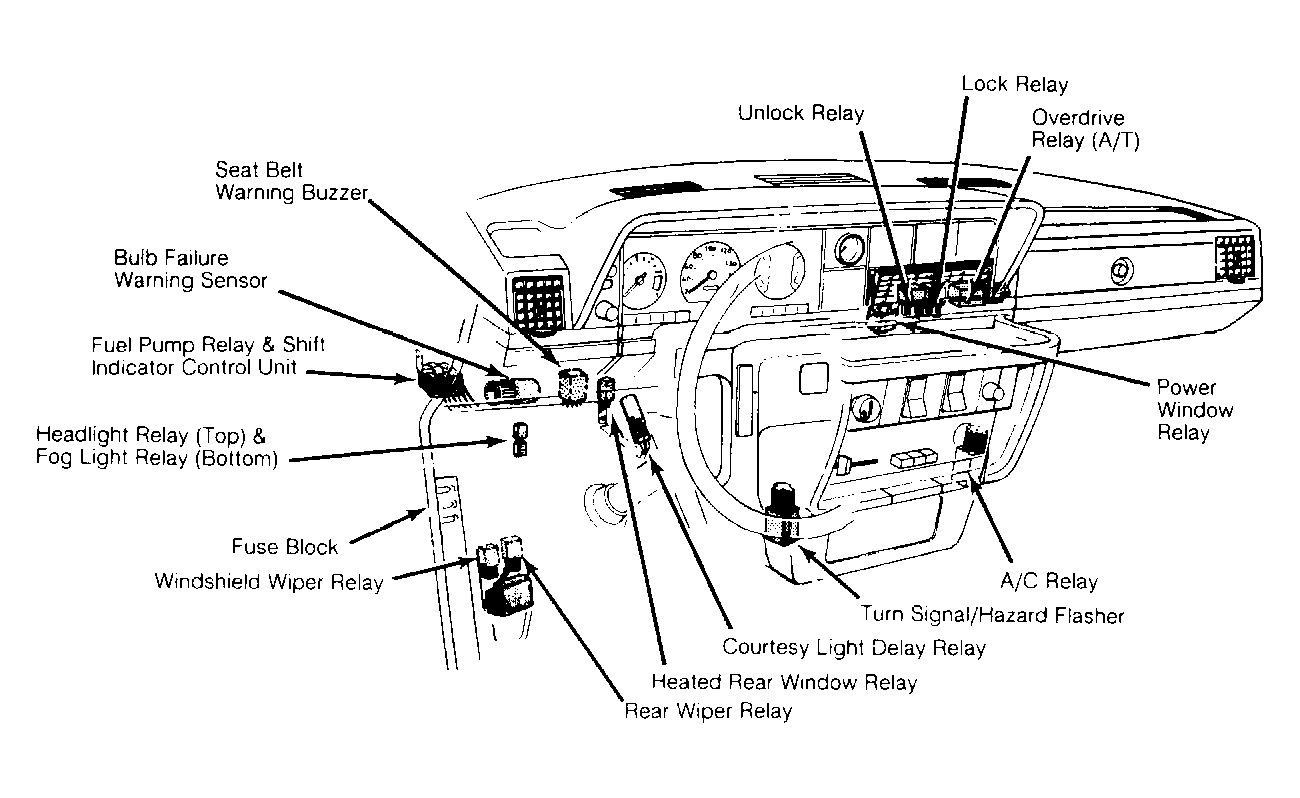 | 1989-90 | Behind glove compartment, on right side of dash. | |