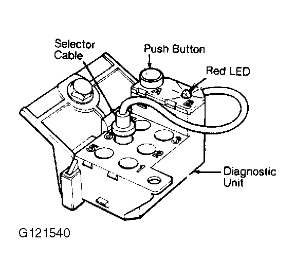 Diagnostic unit for retrieving codes is located in engine compartment, in front of left strut assembly. Diagnostic unit is equipped with an LED indicator, activation button and function select cable. See Fig 1 .