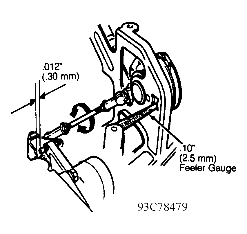 - Recheck clearance. Ensure a .020" (.50 mm) feeler gauge cannot be inserted between lever and adjusting screw. Ensure a .004" (.10 mm) feeler gauge can be inserted between lever and adjusting screw. If clearance is not correct, repeat step 1).