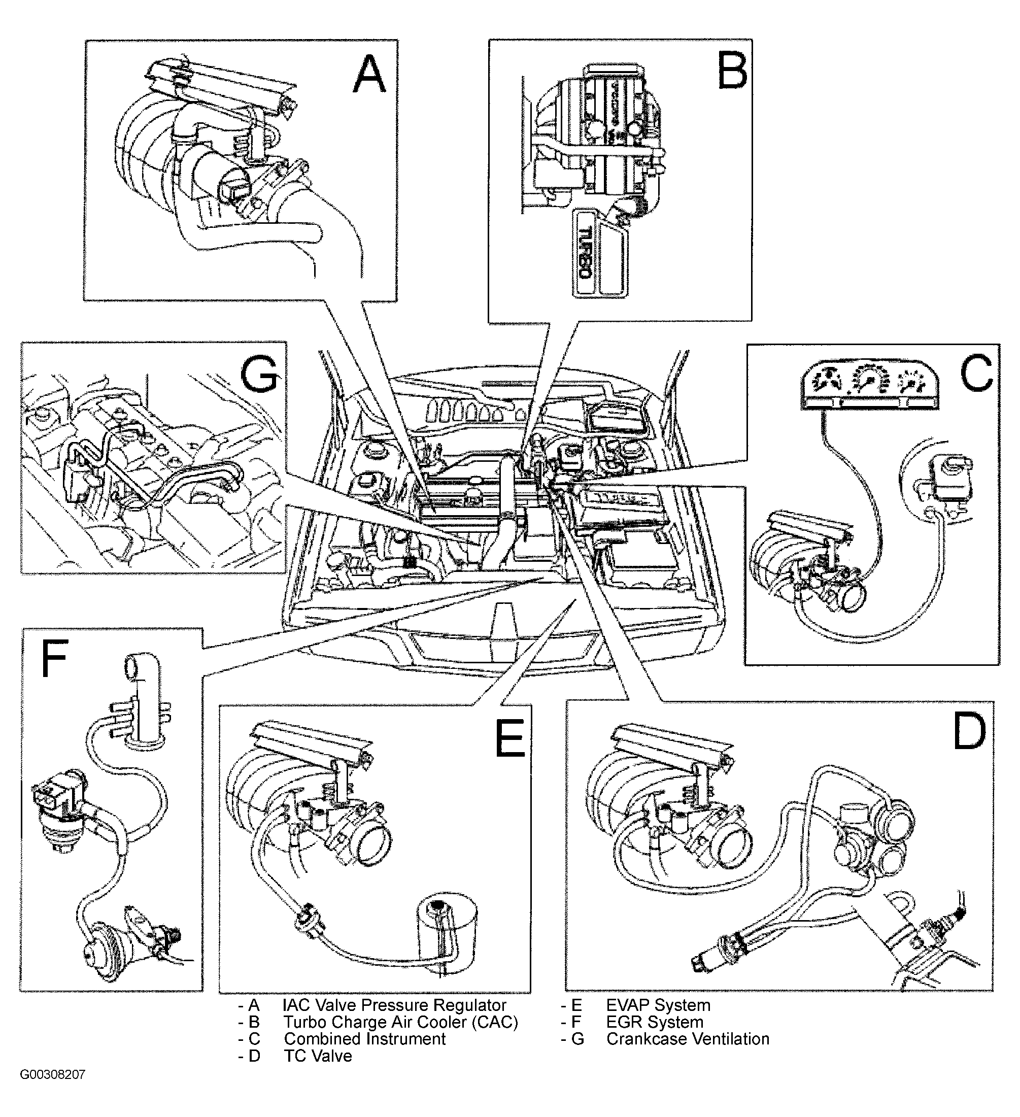 - Check components (A-V). See Fig 2. Check connectors (A-G). See Fig 3. If leak is suspected, spray soap solution onto area of suspected leak to find where air is escaping from. Repair as necessary.