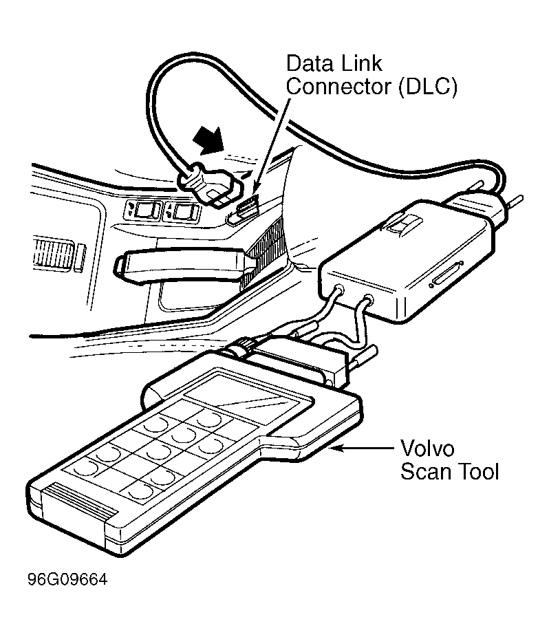 Faults are recorded in ECM memory in the form of Diagnostic Trouble Codes (DTCs). Codes can be displayed using Volvo Scan Tool (998-8686 ) or generic scan tester connected to On-Board Diagnostics II (OBD-II) Data Link Connector (DLC). DLC is located in center console to right of parking brake lever. See Figure.