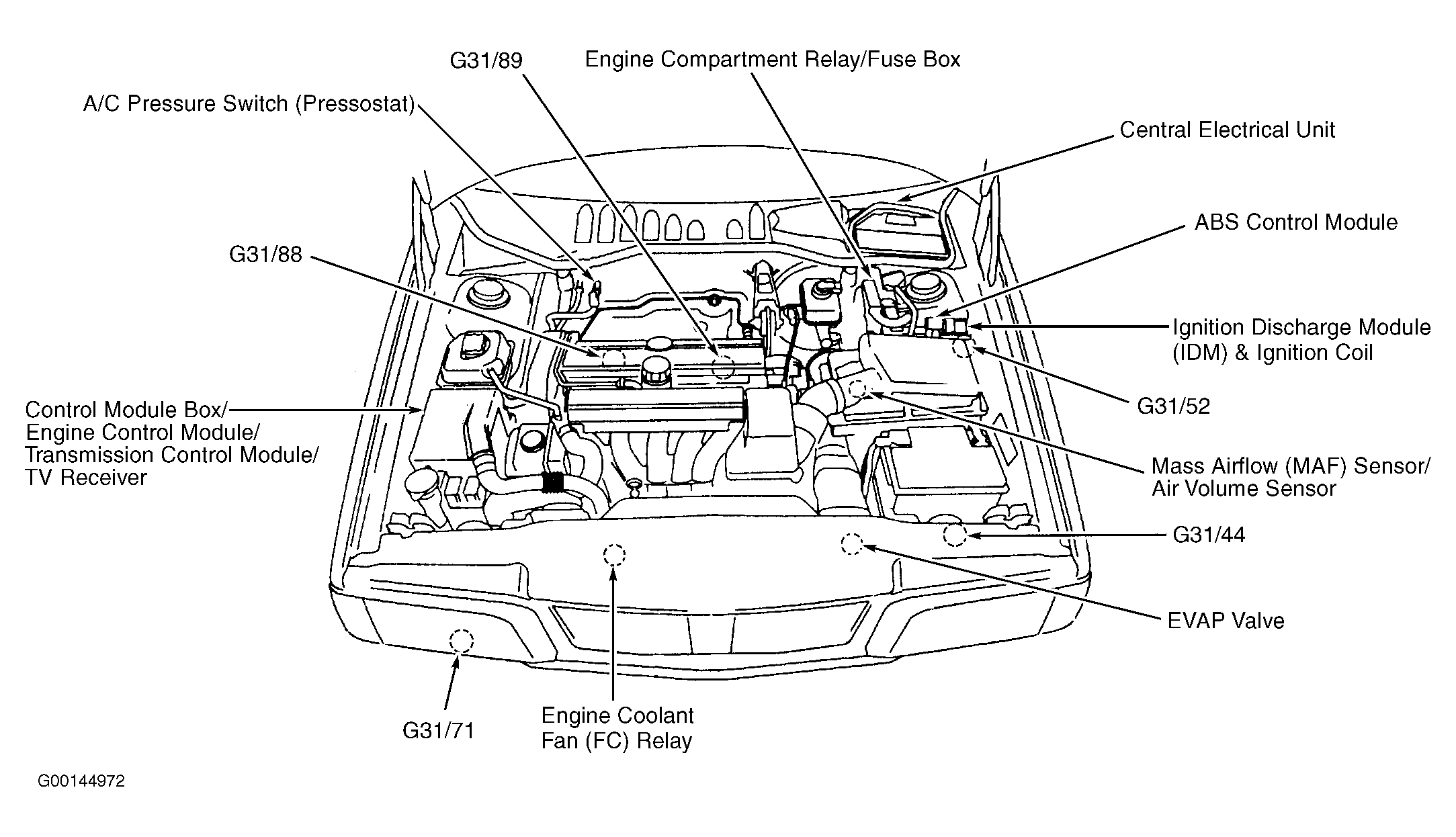 Ignition Discharge Module (IDM) & Ignition Coil On left side of engine compartment, on front of strut tower. See Figure .