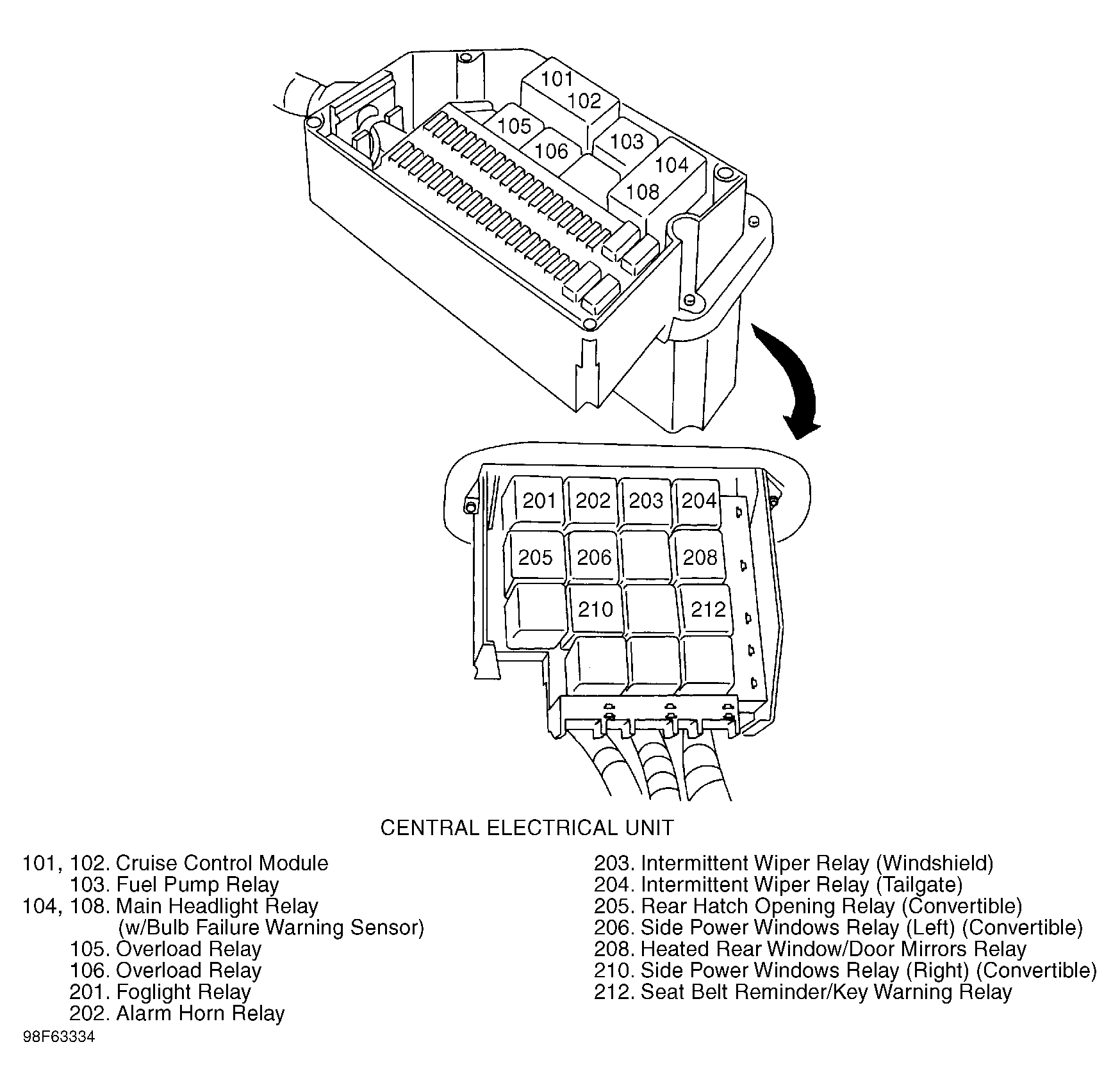 Cruise Control Module On central electrical unit, position Nos. 101 & 102. See Figure .