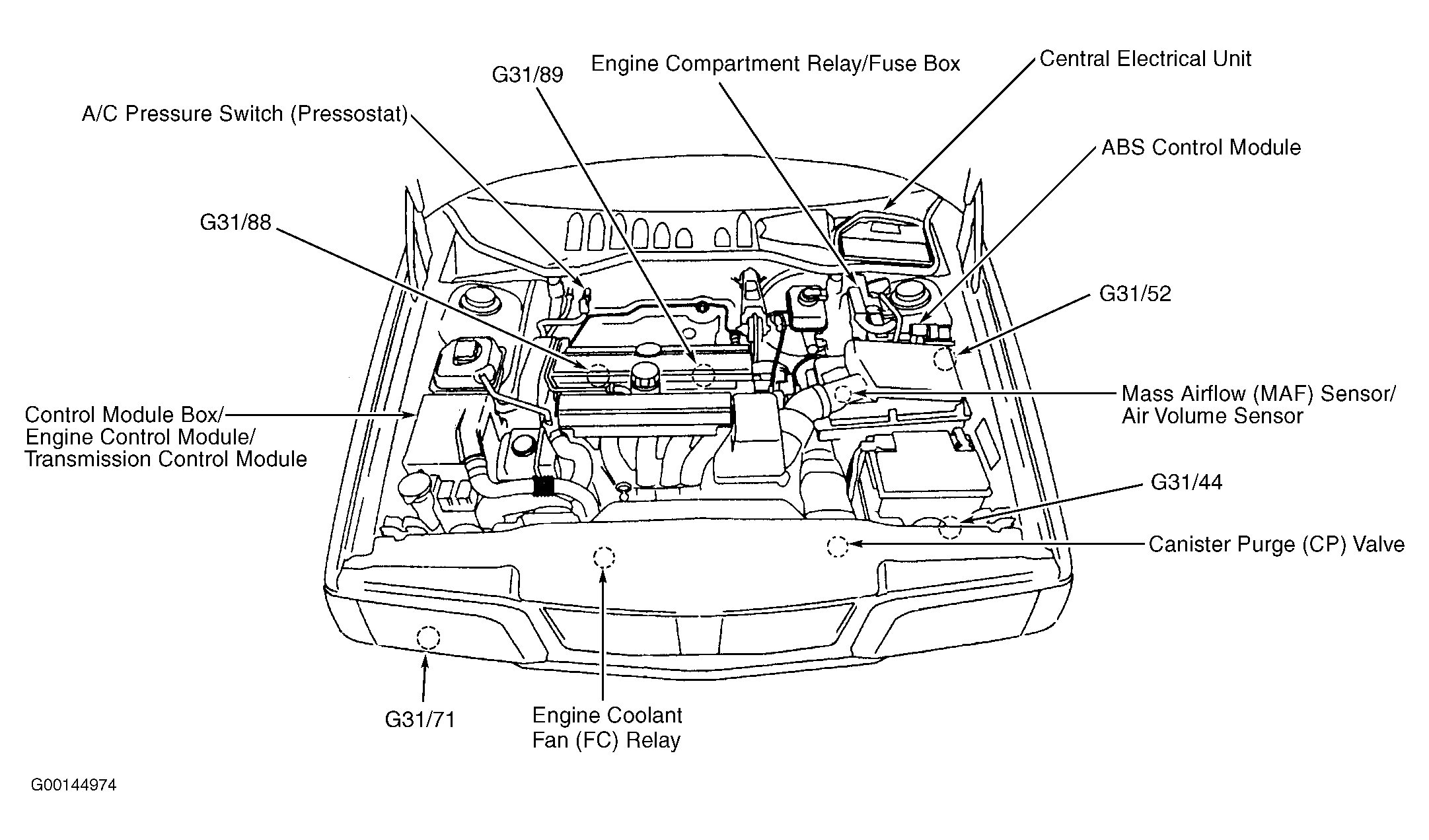 ABS Control Module On left rear of engine compartment. See Figure .