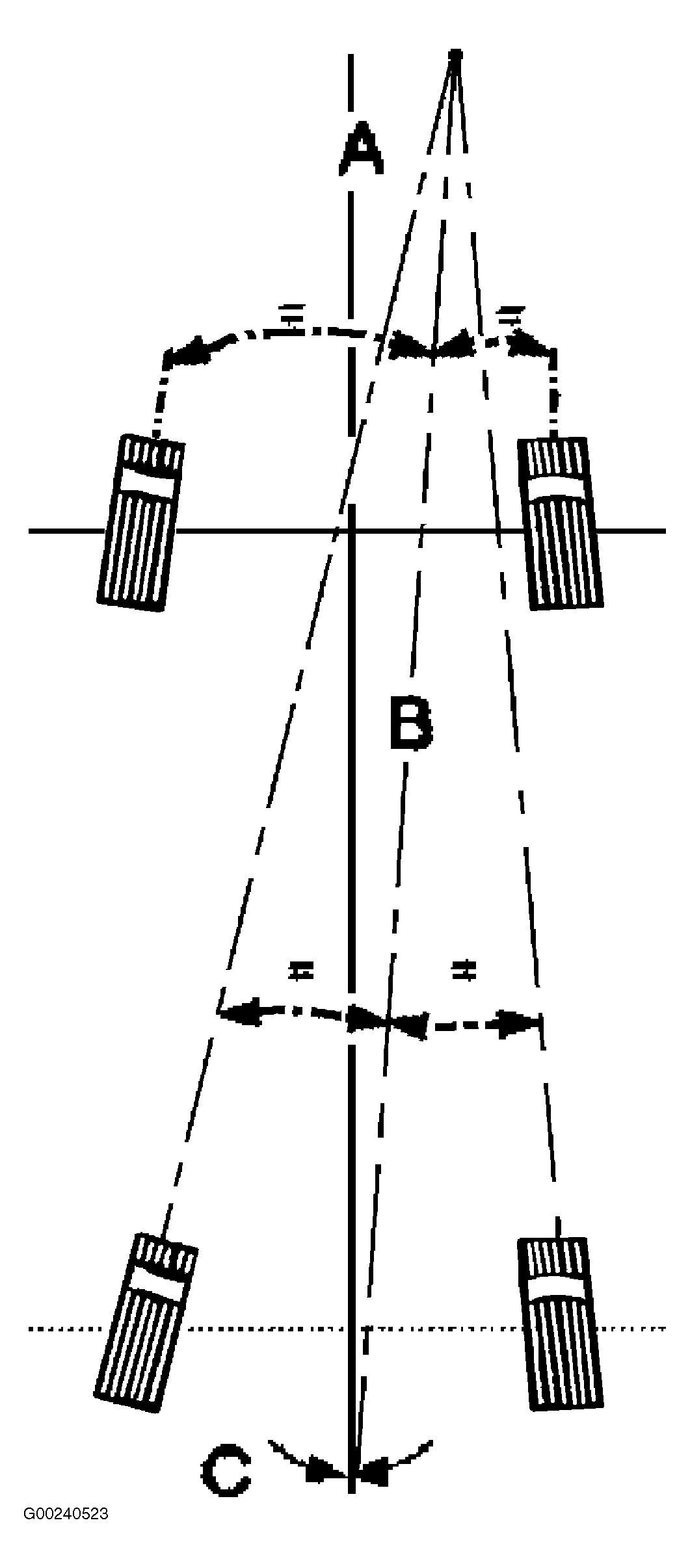 3. Center and lock steering wheel. Check the front wheel toe-in. Check measurement against specification. See WHEEL ALIGNMENT SPECIFICATIONS  . Adjust as needed. See TOE-IN ADJUSTMENT  .