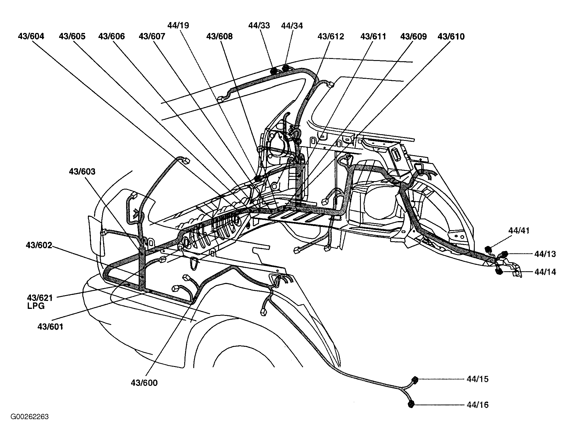 43/606 In rear harness, at left rear corner of vehicle. See Figure .