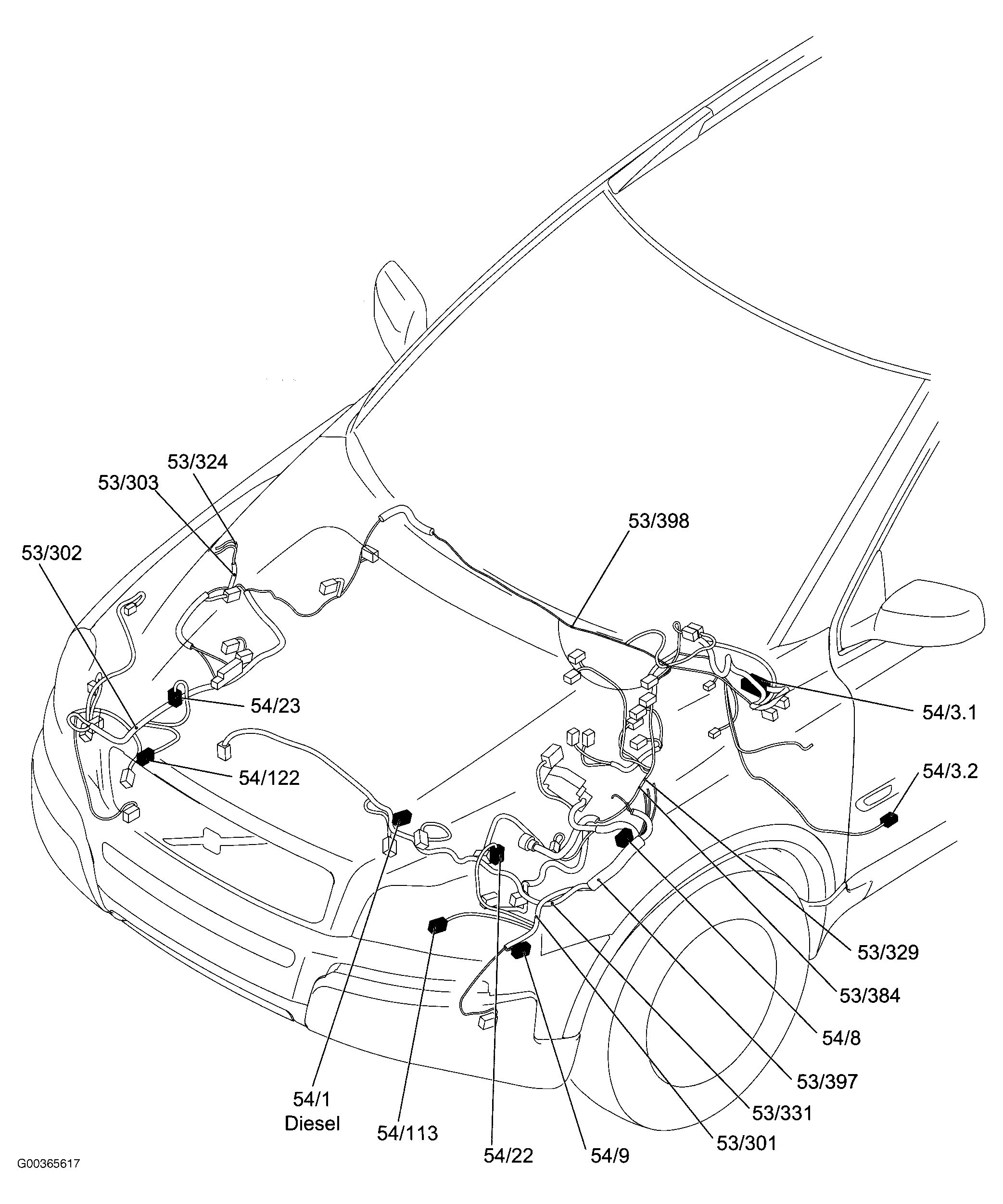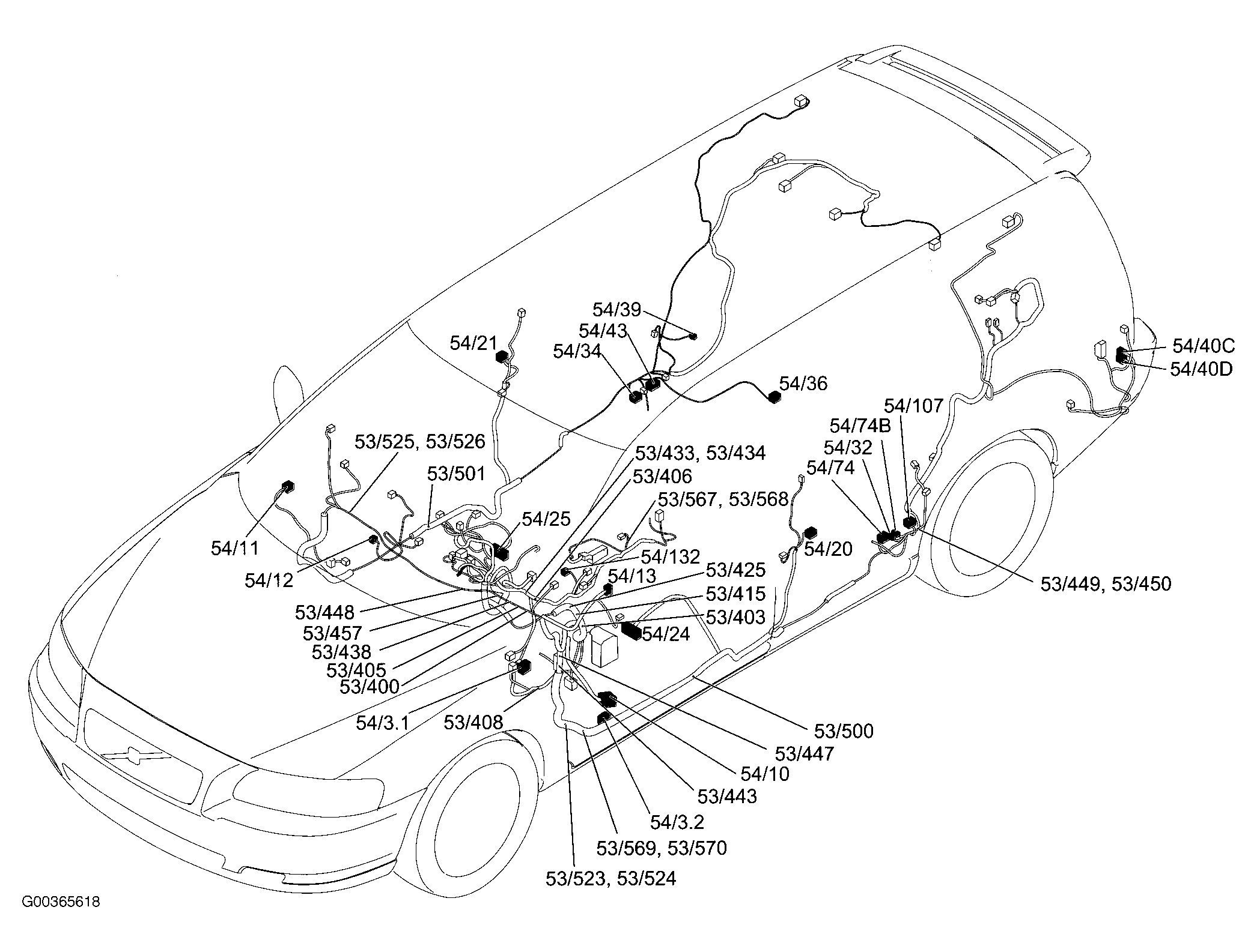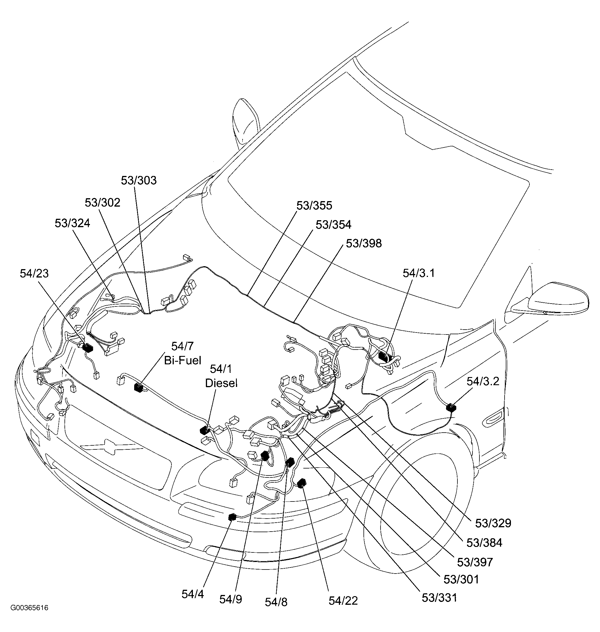 | 53/354 (V70) | In engine compartment harness, rear of engine compartment. See Figure . |