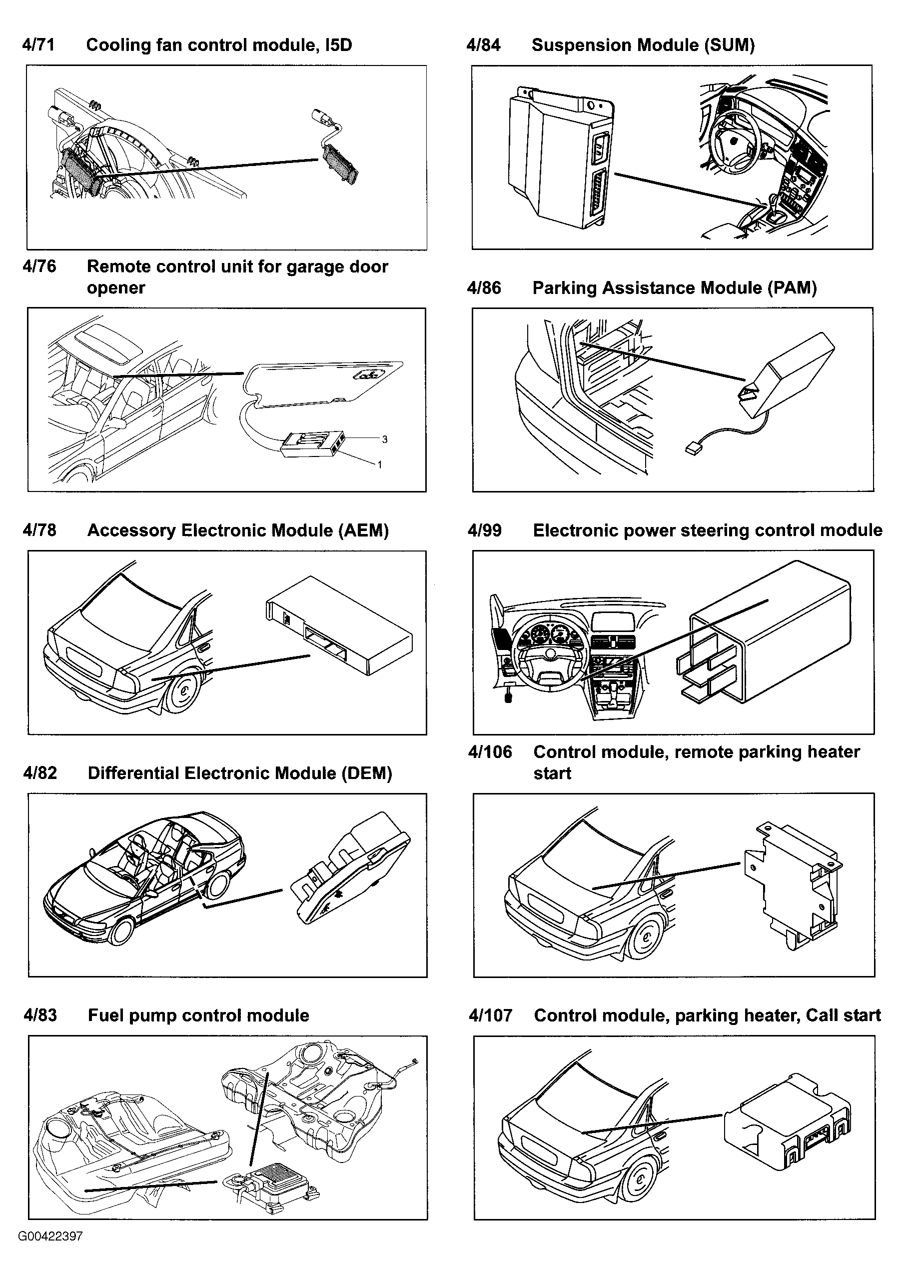 | Parking Heater, Call Start Control Module (4/107) | At luggage compartment. See Figure. |