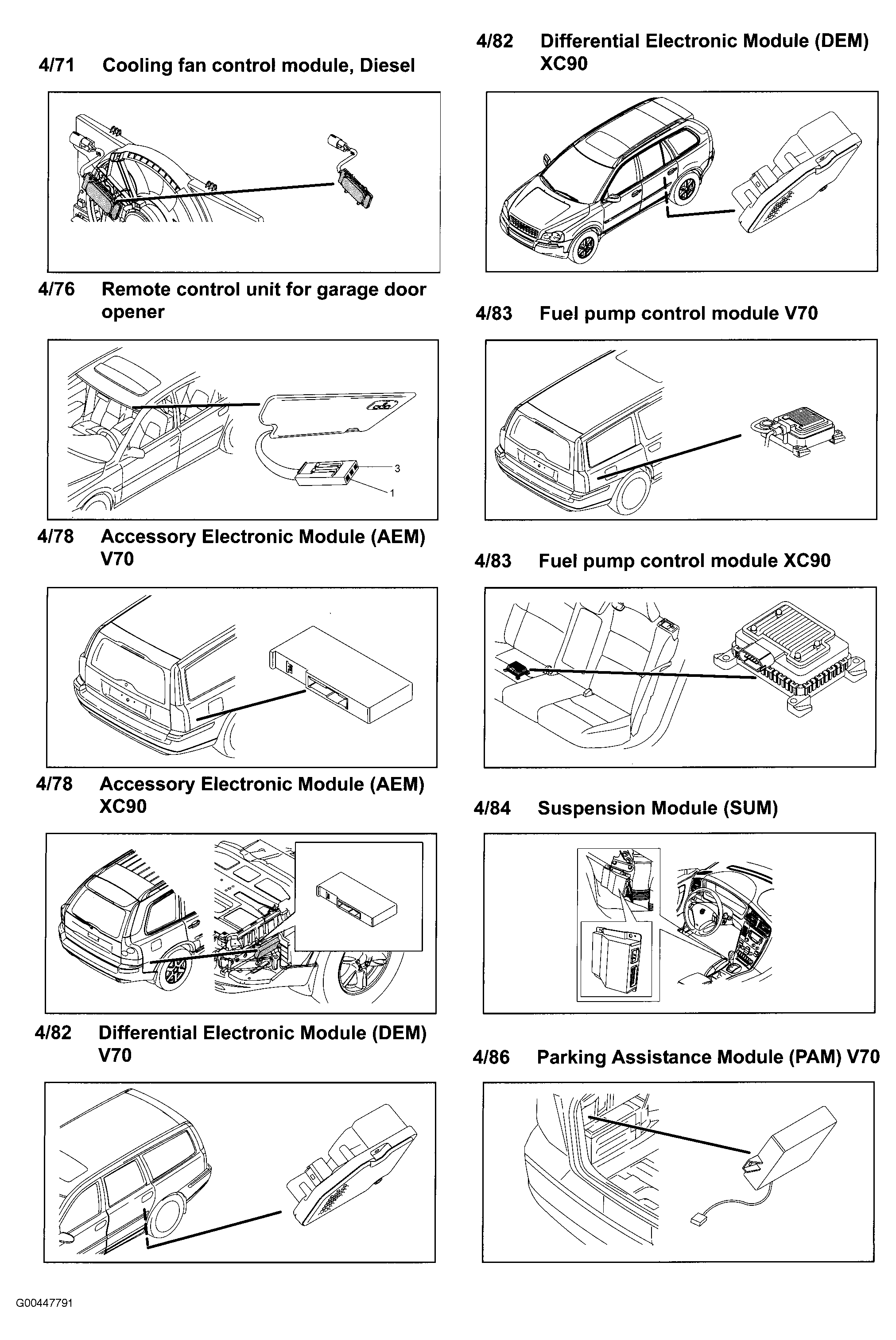 | Parking Assistance Module (PAM) (XC90) (4/86) | At left side of cargo area. See Figure. |