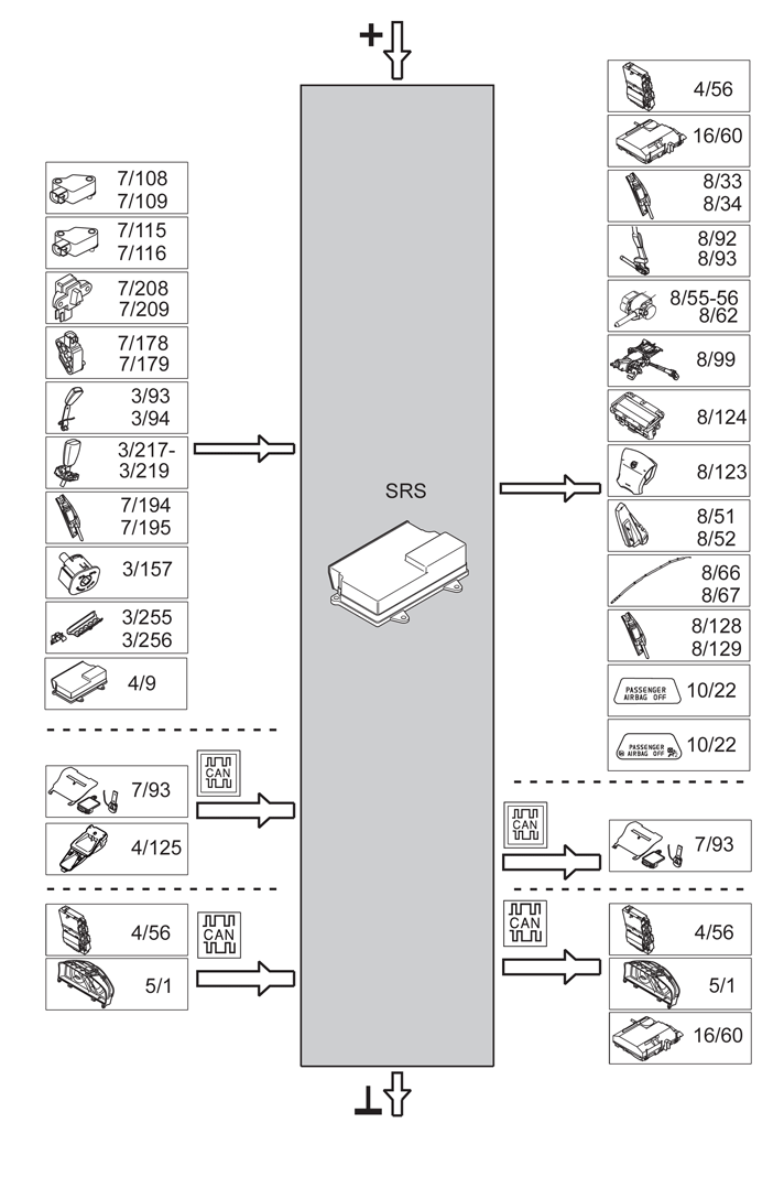 The table below summarizes the input signals to and output signals from the supplemental restraint system module (SRS). The signal types are divided into directly connected signals and CAN communication. Fig 1 displays the same information with the Volvo component designations.