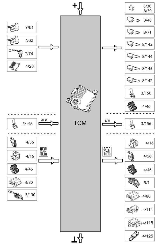- Transmission control module (TCM) gives Gear selector module (GSM) signal about which diodes that are to be lit on the lever carrier's panel, depending on selected gear position. Also sends signal via LIN for deactivation of shiftlock (override) in case of short-circuited direct cable.
