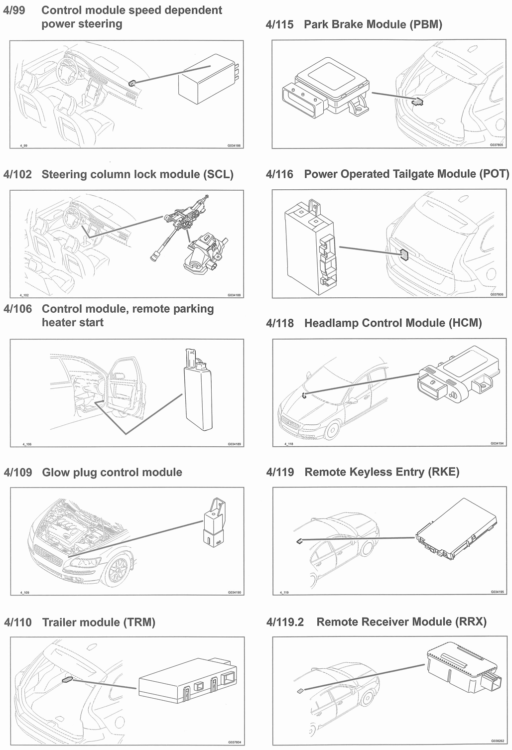 | Park Brake Module (PBM) (4/115) | Left rear of luggage compartment. See Figure. |