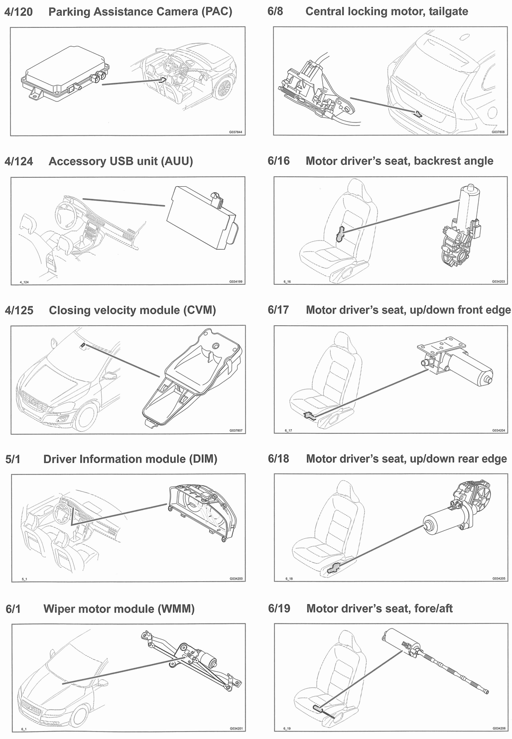 | Parking Assistance Camera Module (PAC) (4/120) | Under driver's seat. See Figure. |