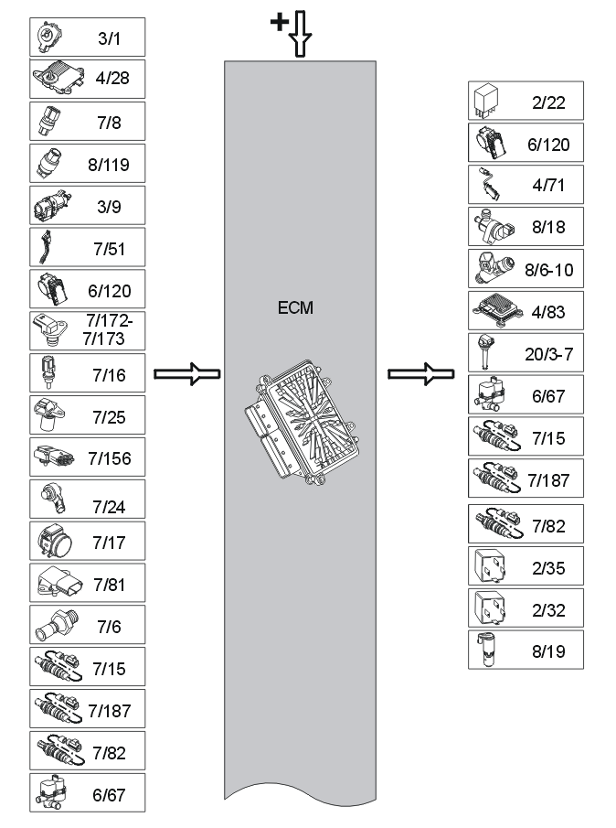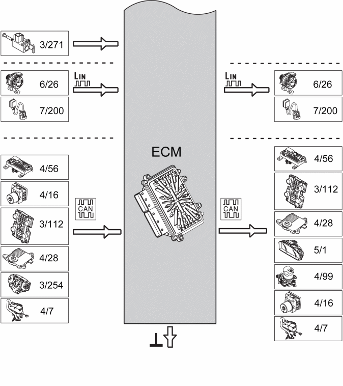 The table below summarizes the input signals to and output signals from the Engine Control Module (ECM). The signal types are divided into directly connected signals, serial communication and controller area network (CAN) communication. The illustrations below (Fig 1 and Fig 2) displays the same information with the Volvo component designations.