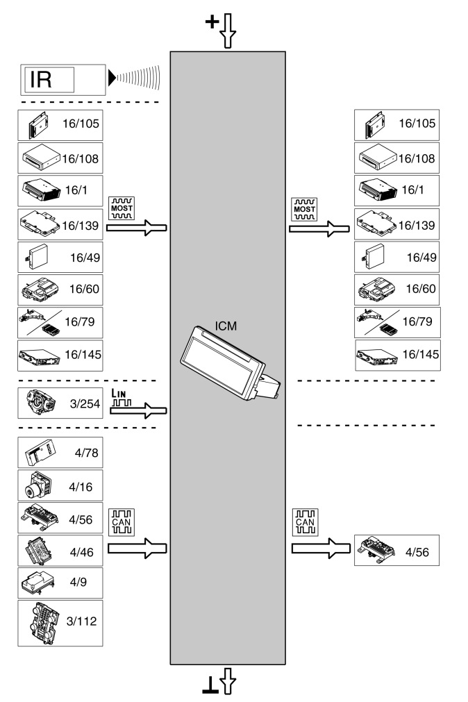The table below summarizes the input signals to and output signals from the infotainment control module (ICM). The signal types are divided into infrared signals (IR), MOST communication, LIN communication and CAN communication. The illustration below (see Fig 1) displays the same information with the Volvo component designations.