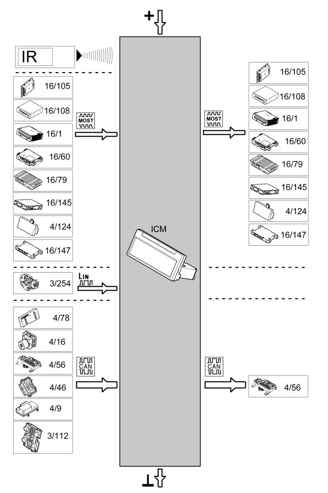 The table below summarizes the input signals to and output signals from the infotainment control module (ICM). The signal types are divided into infrared signals (IR), MOST communication, LIN communication and CAN communication. The illustration below (see Fig 1) displays the same information with the Volvo component designations.
