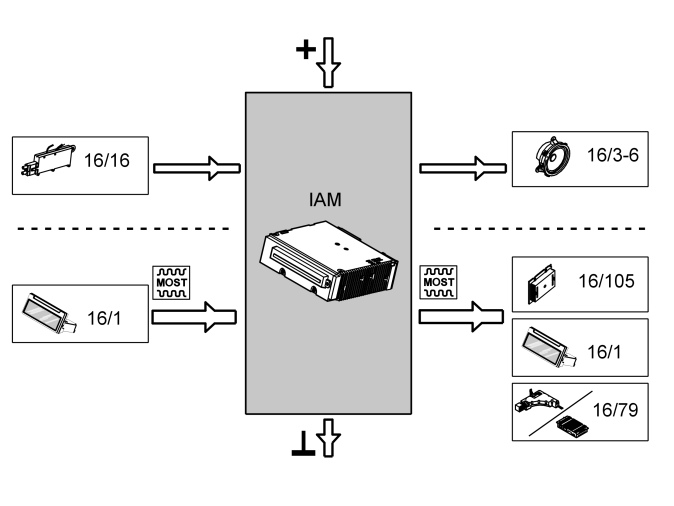 The table below summarizes the input signals to and output signals from the integrated audio module (IAM). Signal type is divided into directly connected signals and MOST communication. The illustration below (see Fig 1) depicts the same information plus Volvo's component designation.
