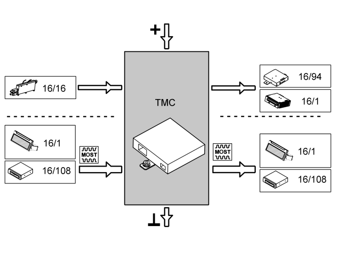 The table below summarizes the input signals to and output signals from the traffic message channel module (TMC). The signal types are divided into directly connected signals and MOST communication. The illustration below (Fig 1) displays the same information with the Volvo component designations.